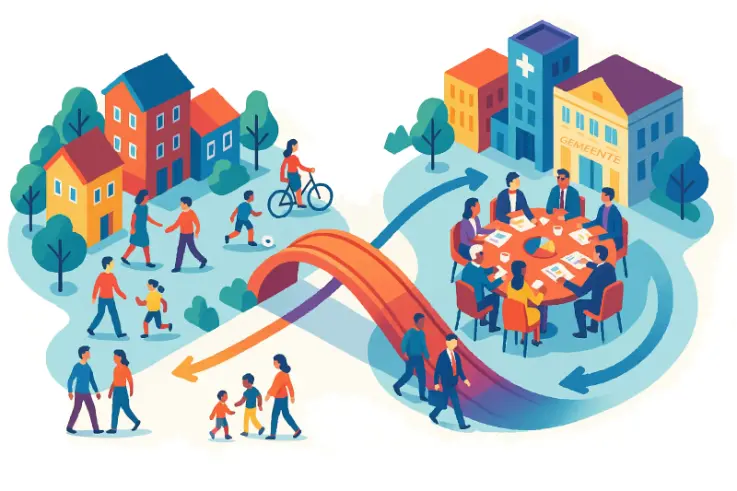 Het gaat niet alleen om inwoners ‘een stem te geven’ of ‘meningen te oogsten’. Het gaat om het weefsel ertussen: de relatie. De beweging van ik–wij–het, waarin systemen leren luisteren, beroepskrachten kunnen meebewegen en gemeenschappen hun eigen wijsheid inbrengen. Het gaat om het bij elkaar aansluiten: wat kan een ziekenhuis betekenen voor een zorgzame gemeenschap? En andersom? Luisteren naar elkaars vragen. Van daaruit bouwen aan vertrouwen.